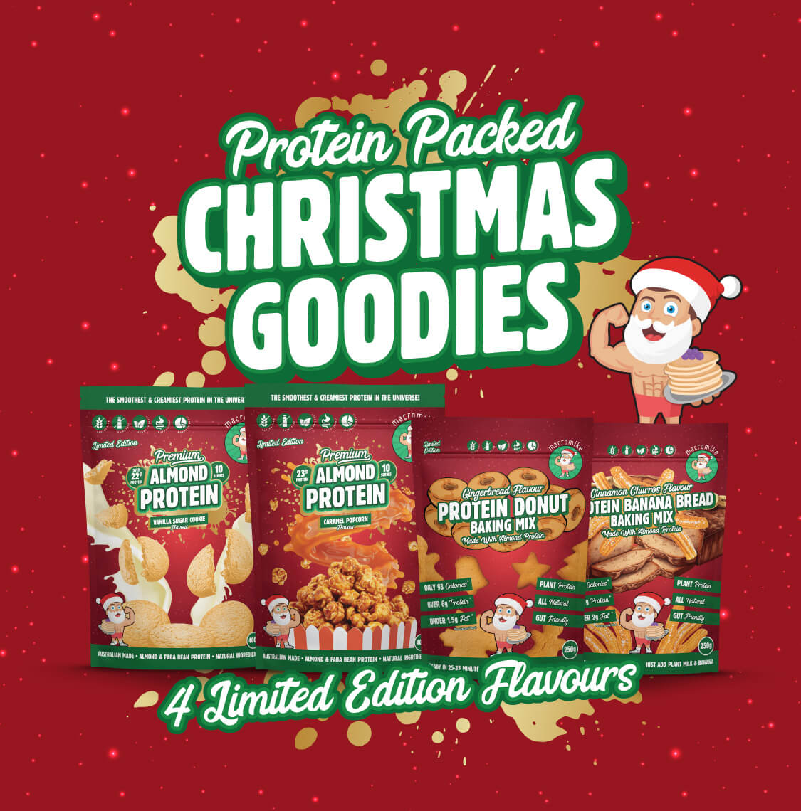 Christmas has landed at Macro Mike! Limited-edition, plant-based festive treats that are high-protein, dairy-free, and gluten-free. Bake, sip, and snack your way through the holidays. Get in quick! Once they’re gone, they’re gone.