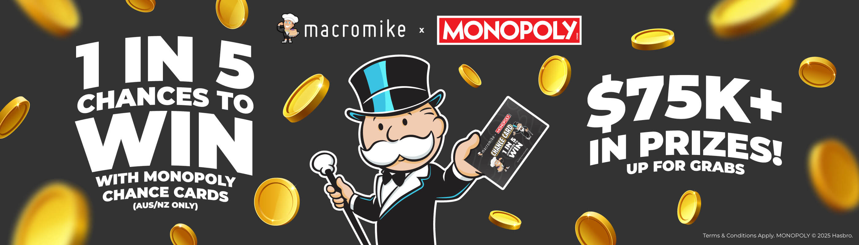 Starts 10:00 AM AEST 18/11/25. Ends 11:59 PM AEST 2/12/25. Input unique winning code to claim prize by 11:59 PM AEST 16/12/25. Open to AUST & NZ residents who fulfil the entry/eligibility requirements. Make eligible purchase (AUD$135 min spend) at macromike.com.au for chance to win a prize. Winners notified instantly upon revealing chance card code. 10,000 prizes. Major prize AUD $5,000 Flight Centre voucher. Total prize pool AUD $88,880 (inc GST). Winners of prizes AUD $250 and above published at macromike.au/terms by 19/12/25. Macro Mike Pty Ltd. ABN 90 615 313 856. 5/7 Ern Harley Dr Burleigh Heads QLD 4220. NSW Authority No. TP/04619, ACT Permit No. TP 25/02279, SA Permit No. T25/1730. For full T&Cs and details of prizes refer to macromike.com.au.