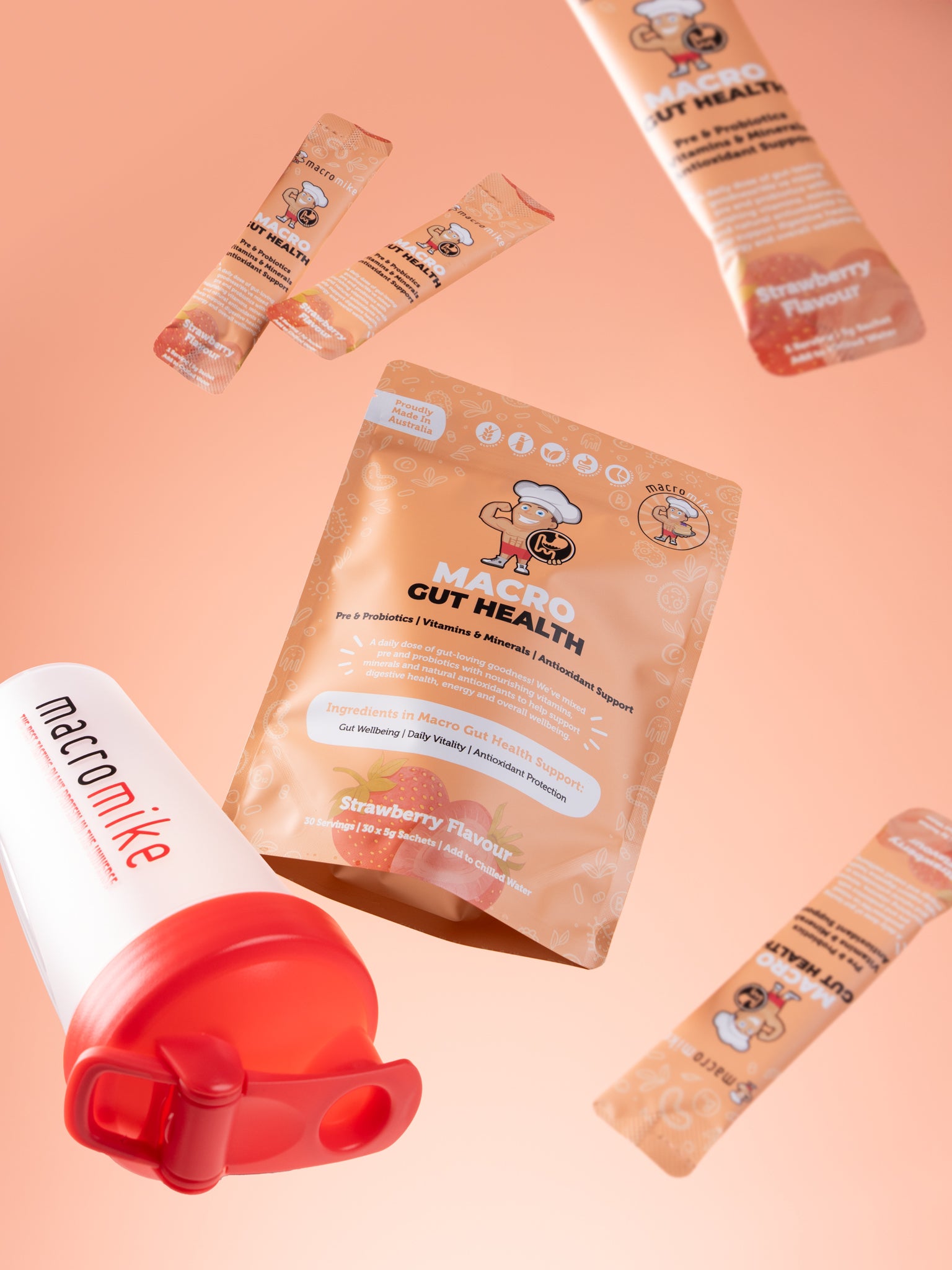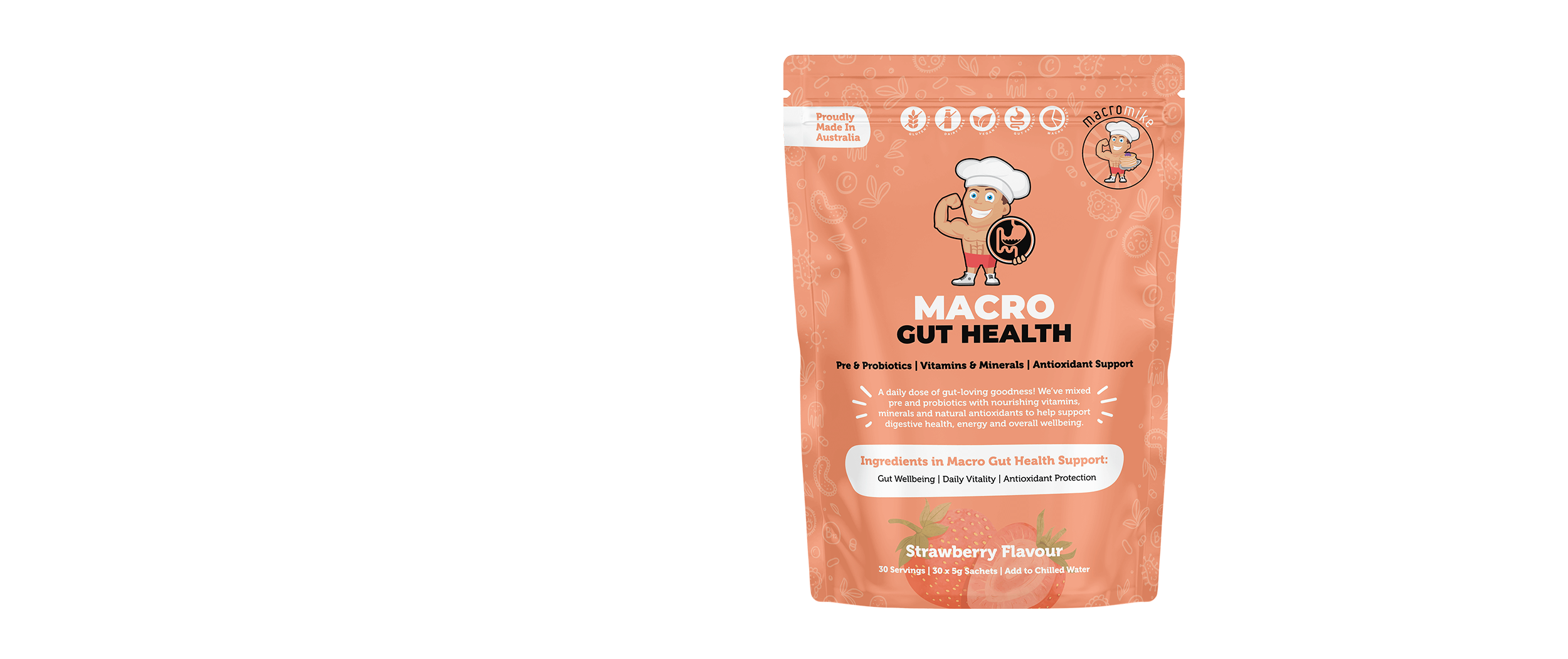 Macro Gut Health includes pre- and probiotics, alongside added vitamins and minerals to support gut health!
