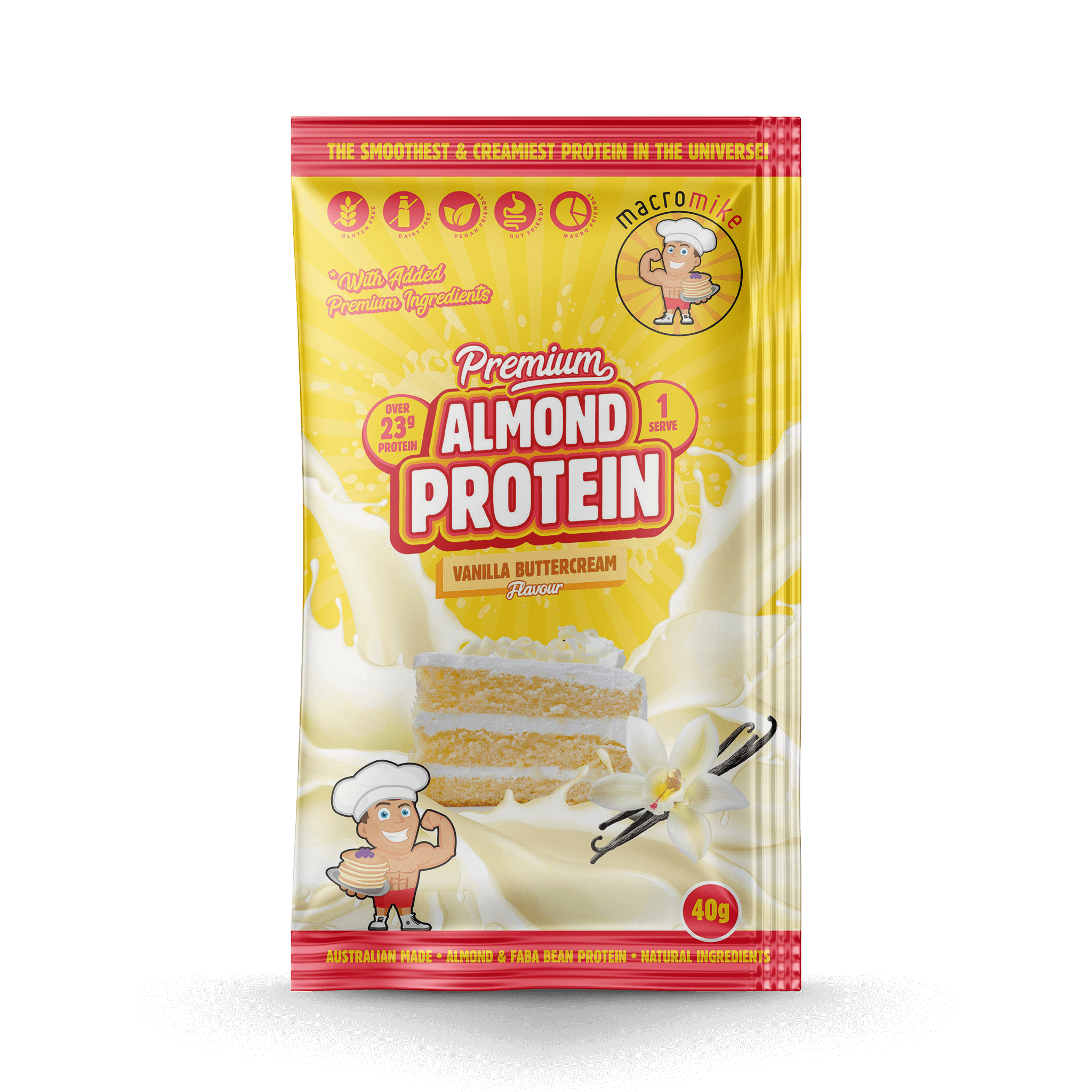 Nutritional Information is based off our Vanilla Buttercream flavour and may vary for other Premium Almond Protein flavours.